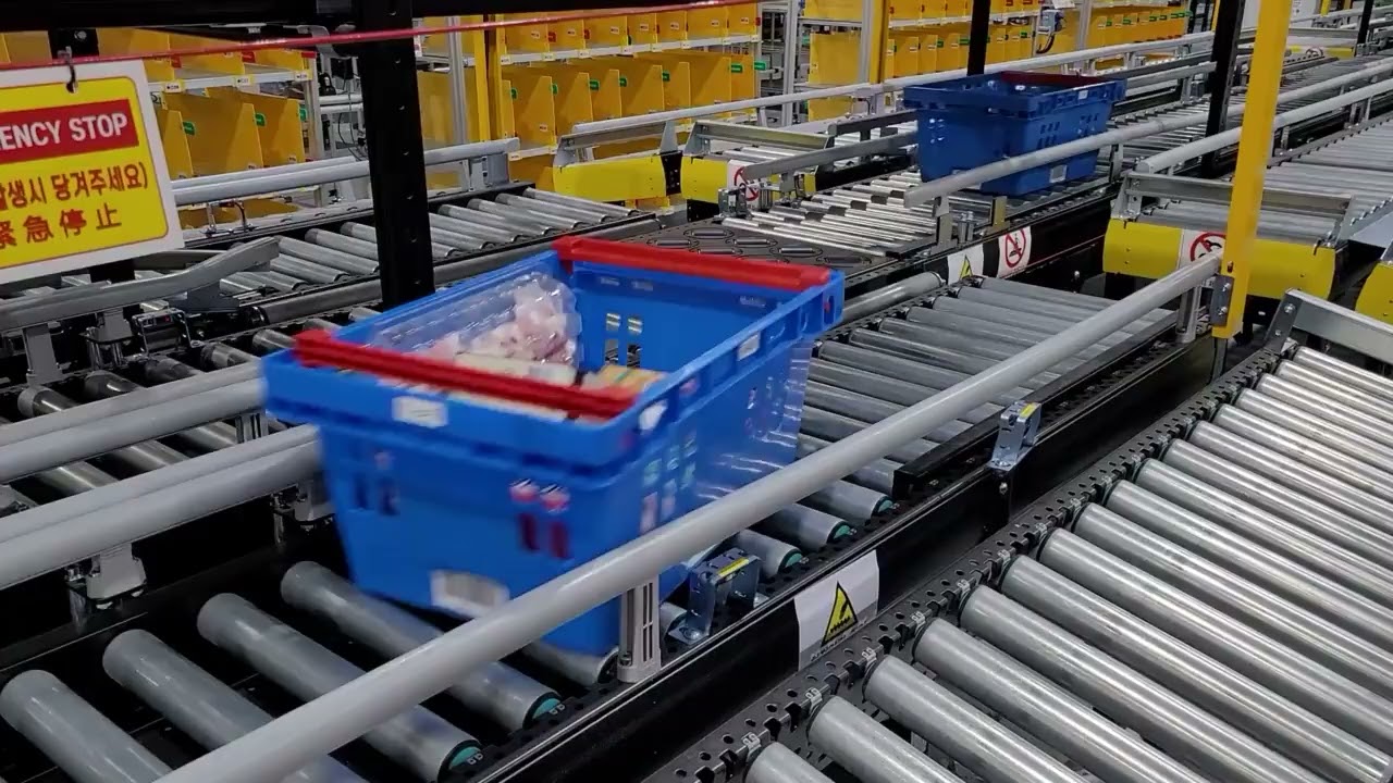 물류 및 유통 센터에서 물품을 고속으로 분류하는 장비입니다.